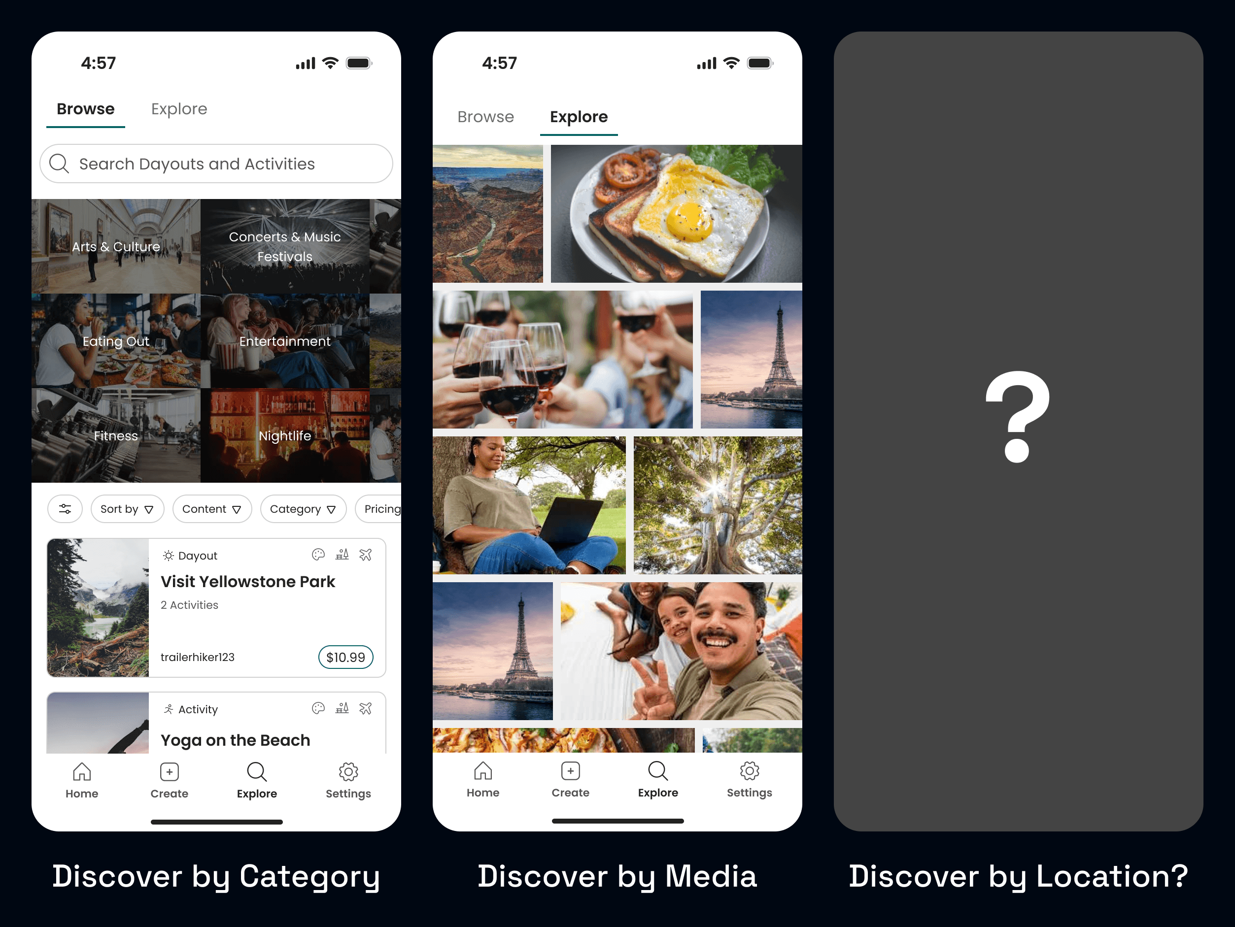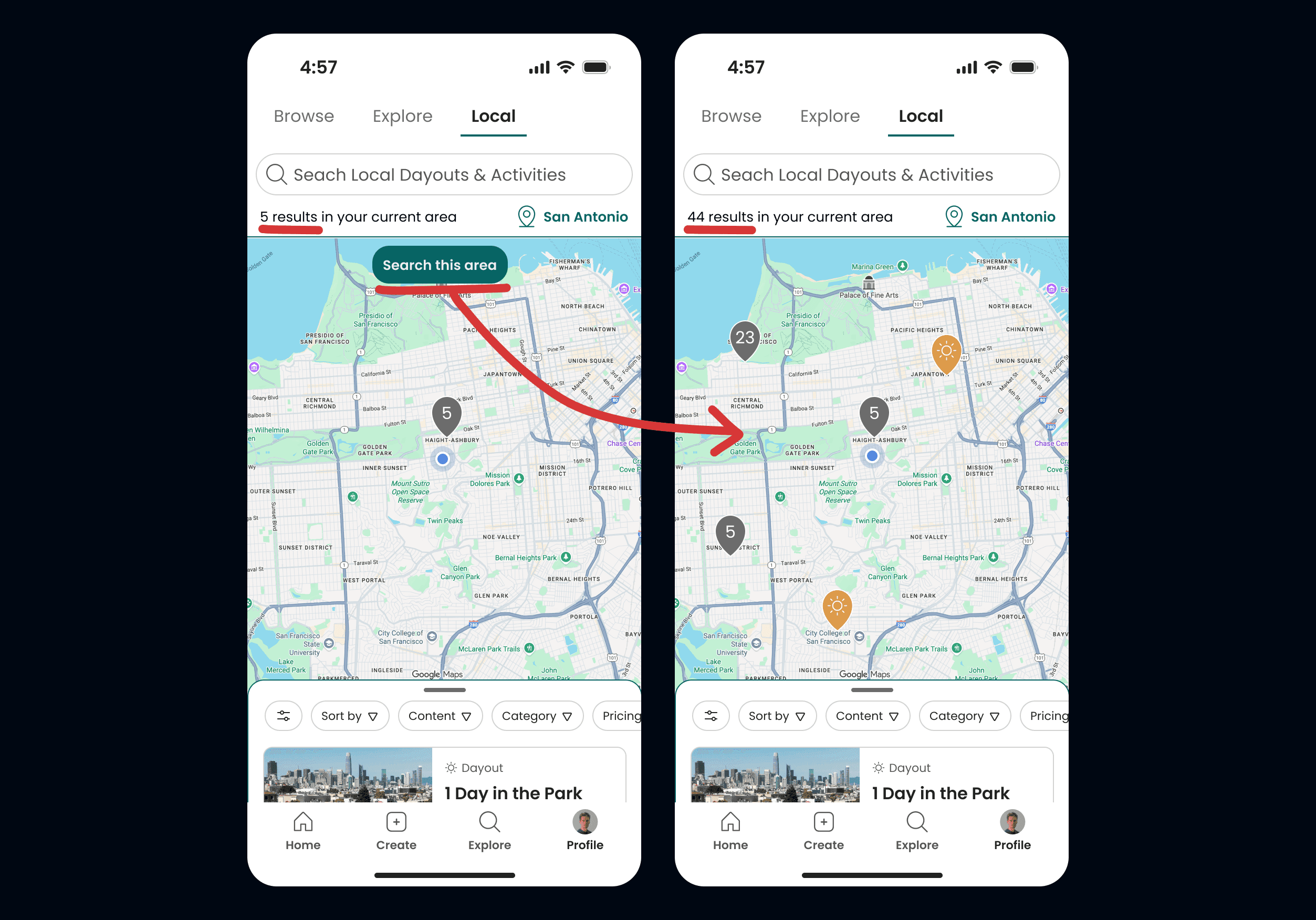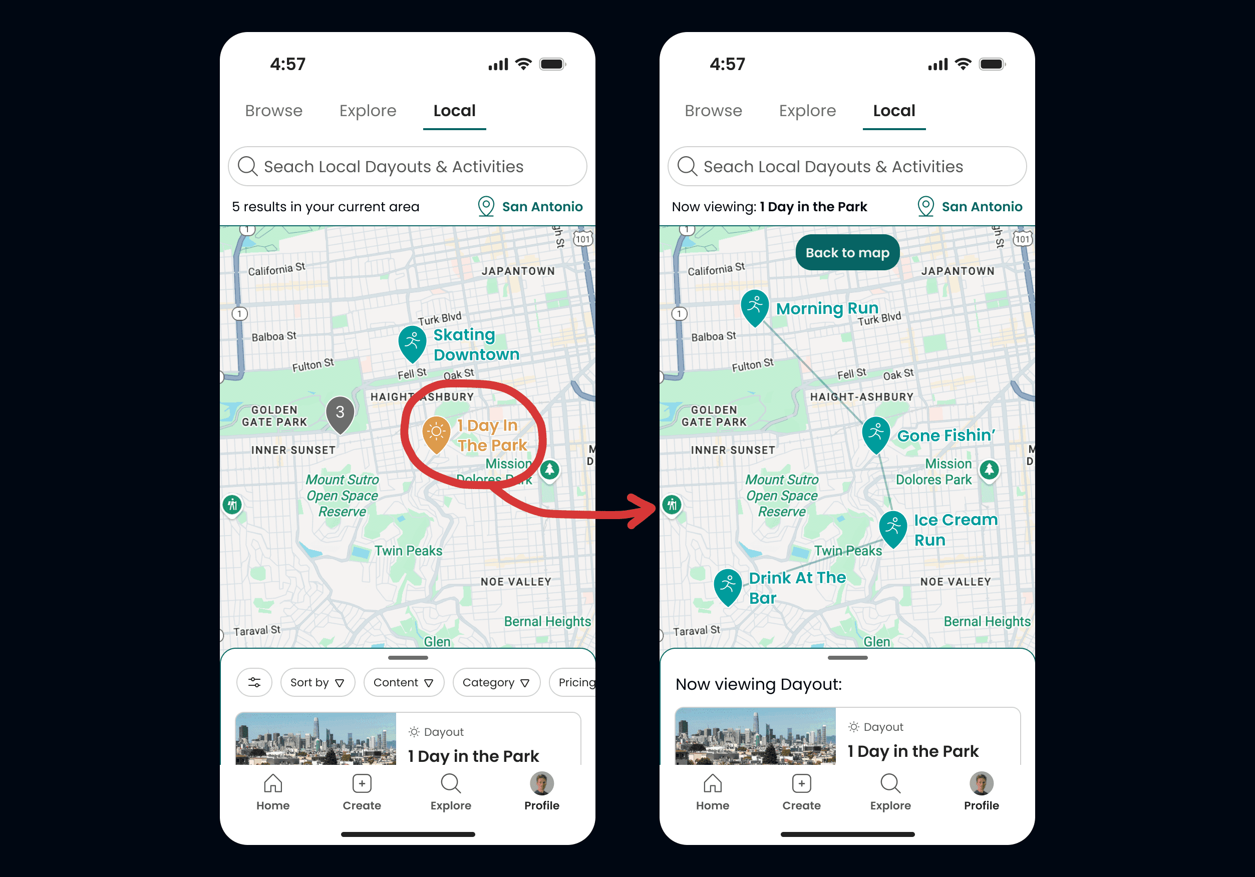 Given the time limit, I defined a singular goal: create a location-based discovery funnel that directs users from the map discovery into the app's detail page, where users see full information about a Dayout or Activity.