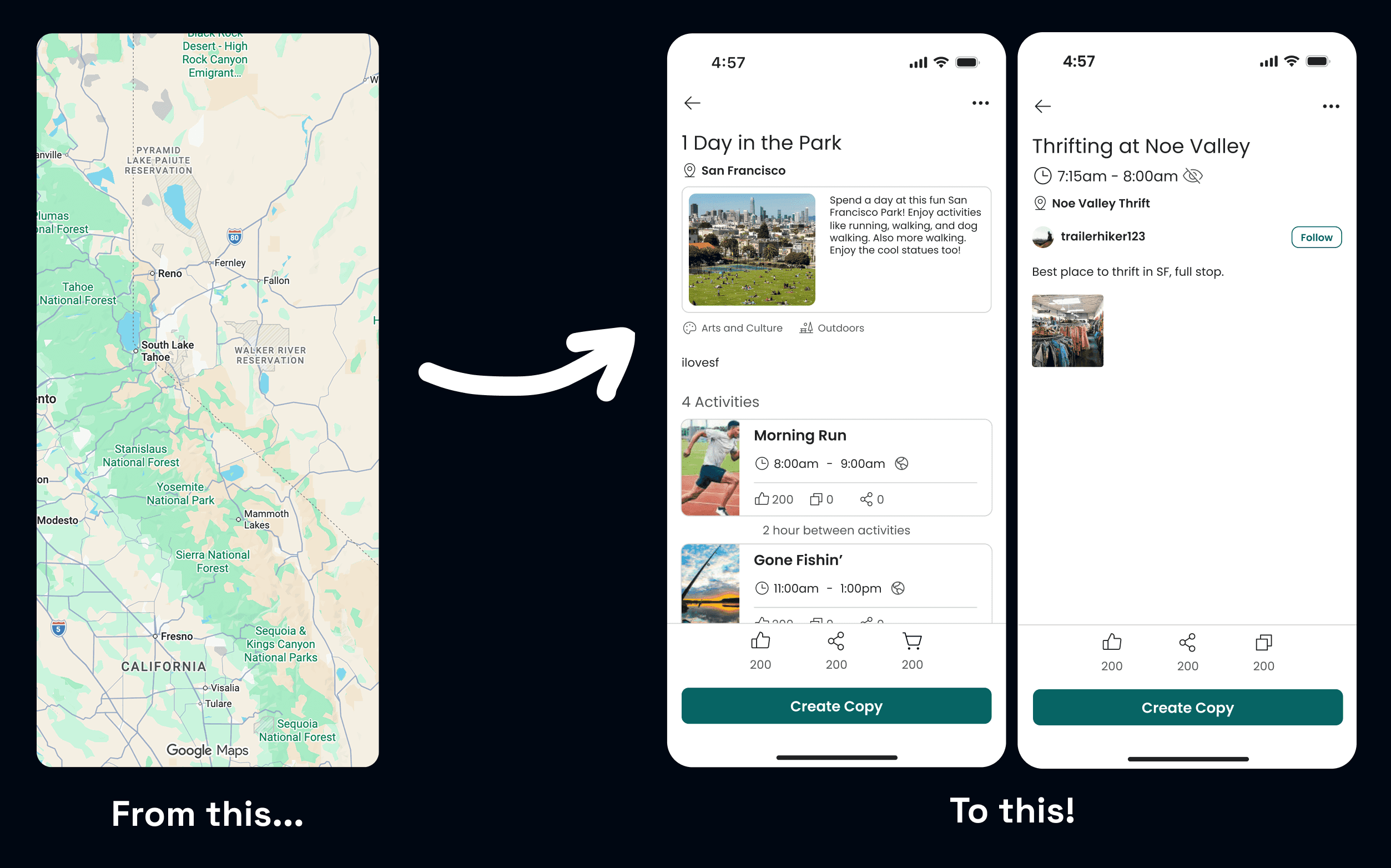 To solve this, I introduced a timeline view that connects each Activity's location on the map, letting users visualize the Dayout's full path.
