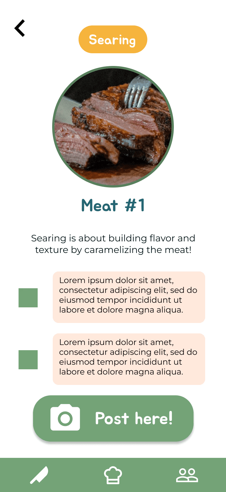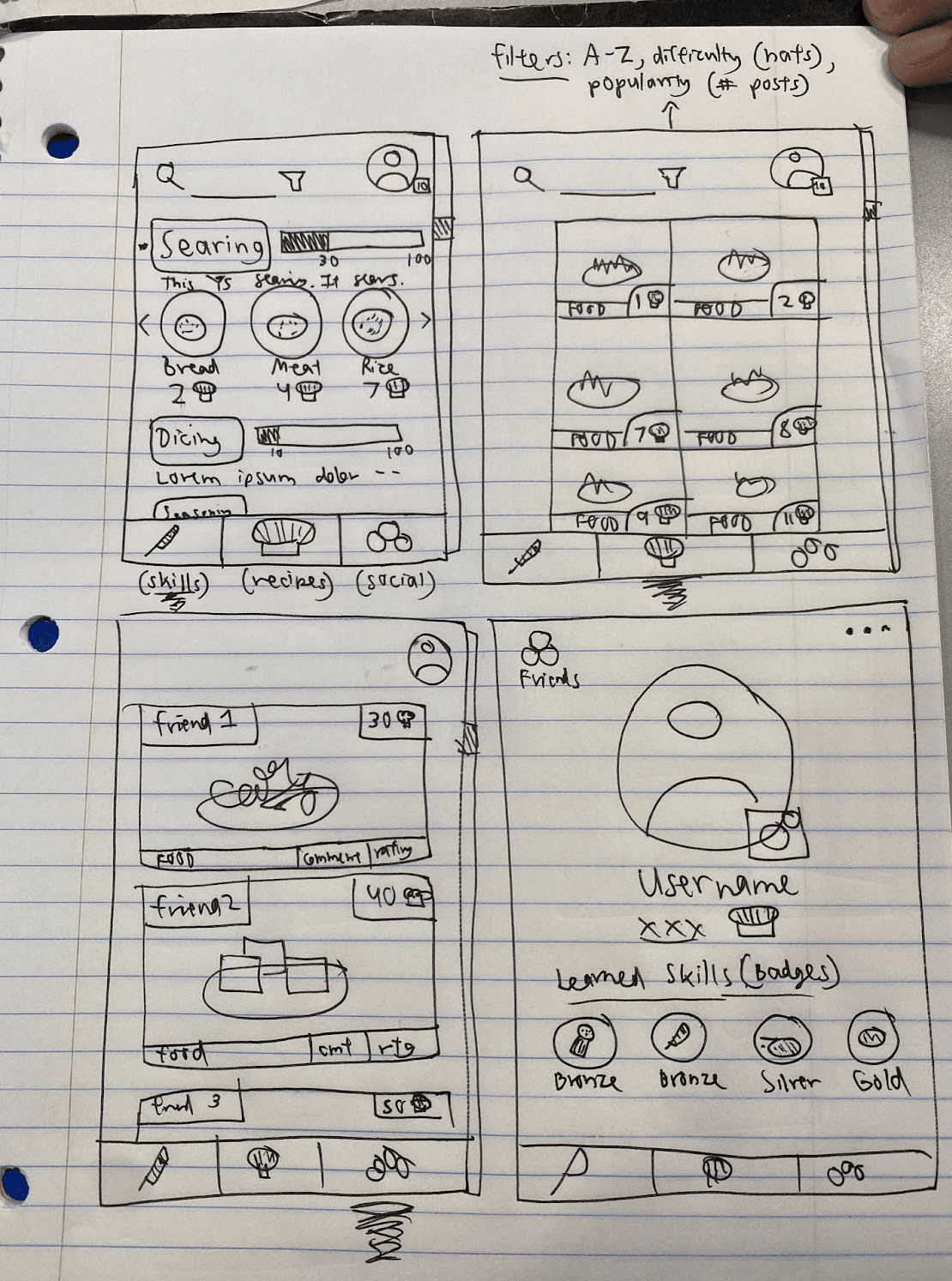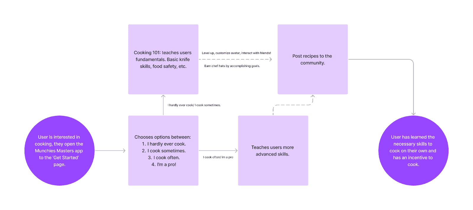 As part of a design workshop with Design Co at UCSD, my team and I designed Munchie Masters, an app for college students designed to make cooking easier, more engaging, and socially interactive. Munchie Masters gamifies the cooking process through rewards, social engagement features, and a leveling system where users can progress by learning skills and cooking recipes.