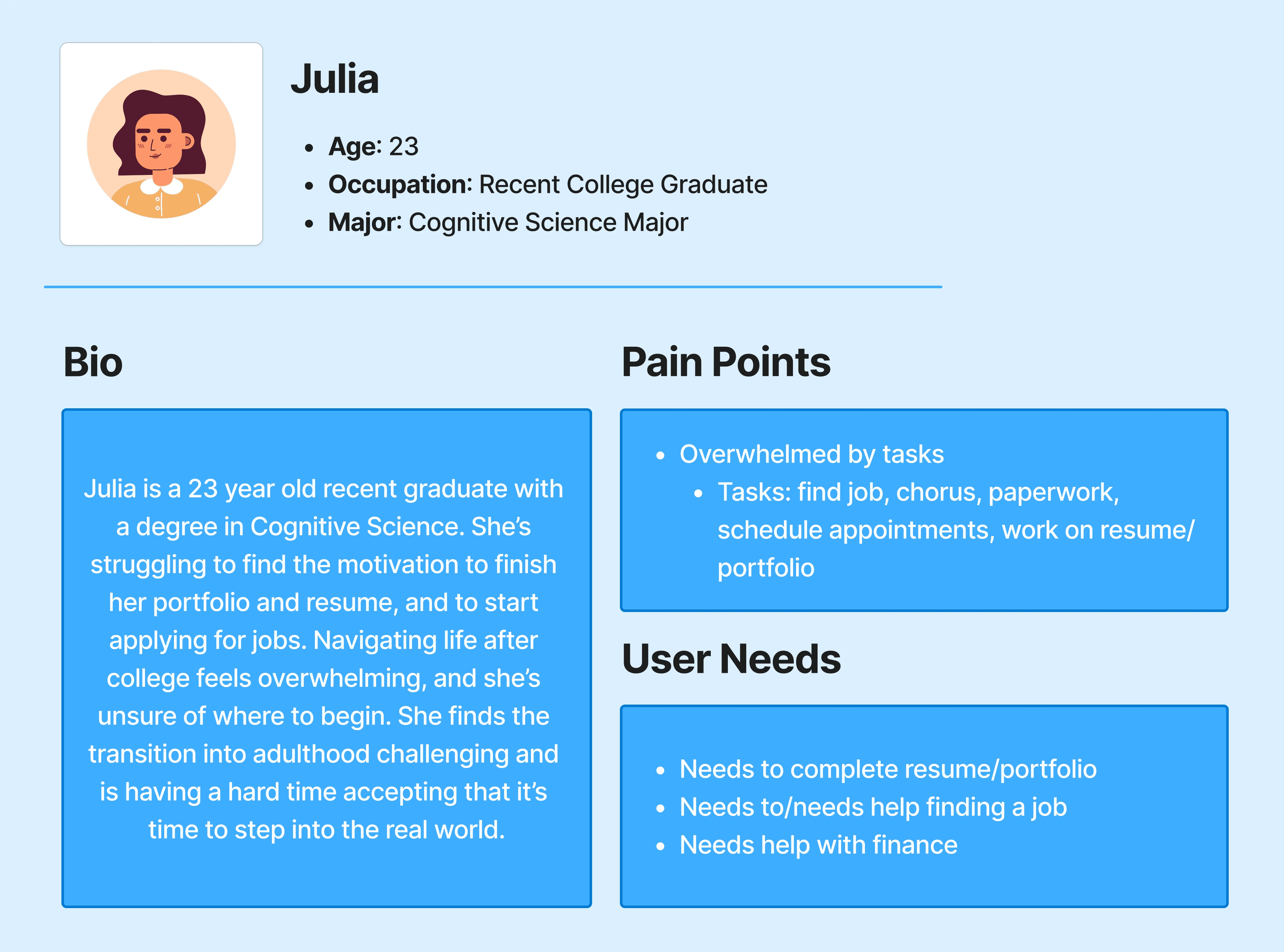 Through these interviews, we were able to synthesize our results into a user persona: Julia, a fresh college grad still figuring her way through adult life.