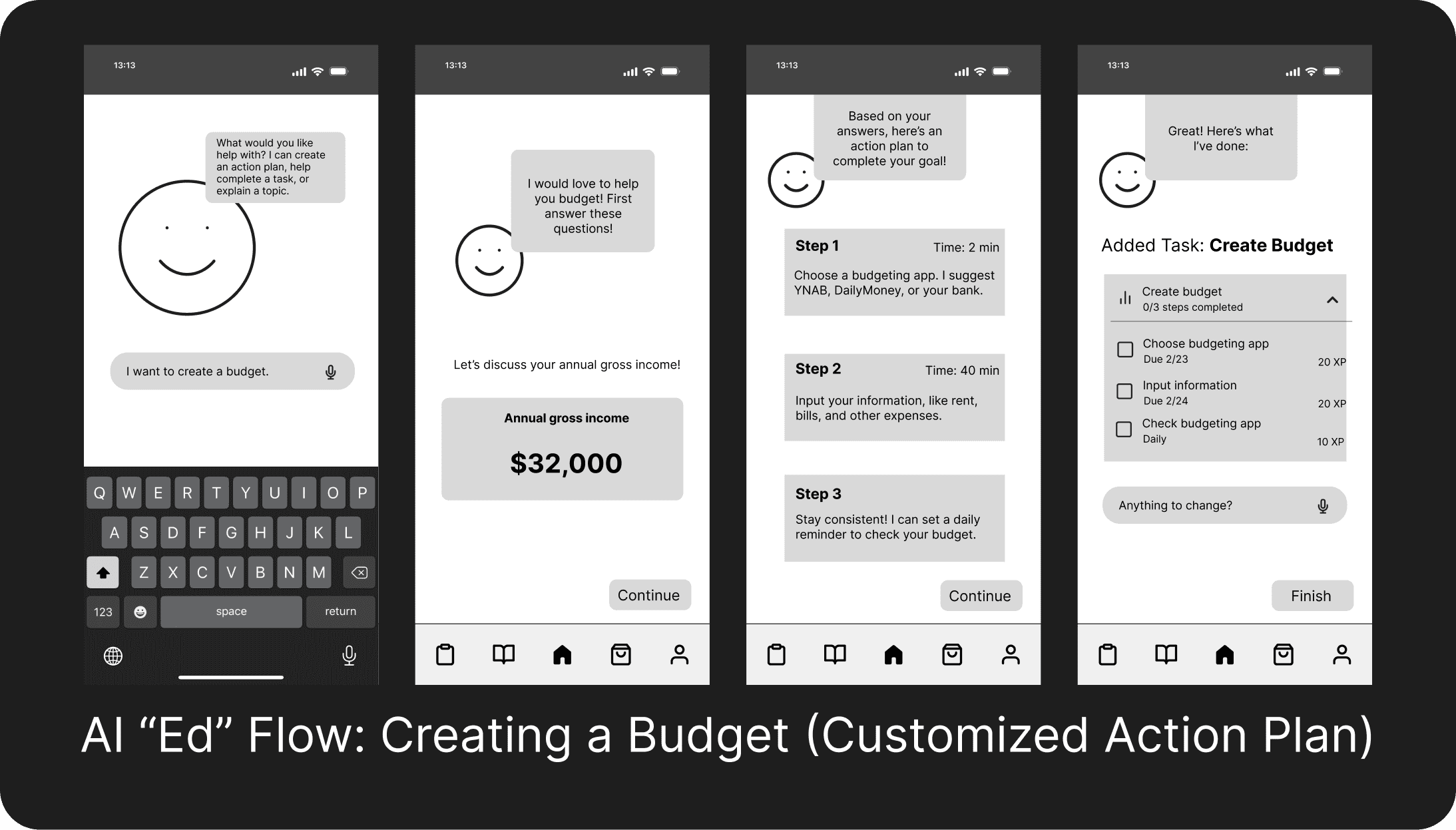 Here's one user flow I created that shows how Ed can turn a broad goal like "make a budget" into a manageable, step-by-step action plan.