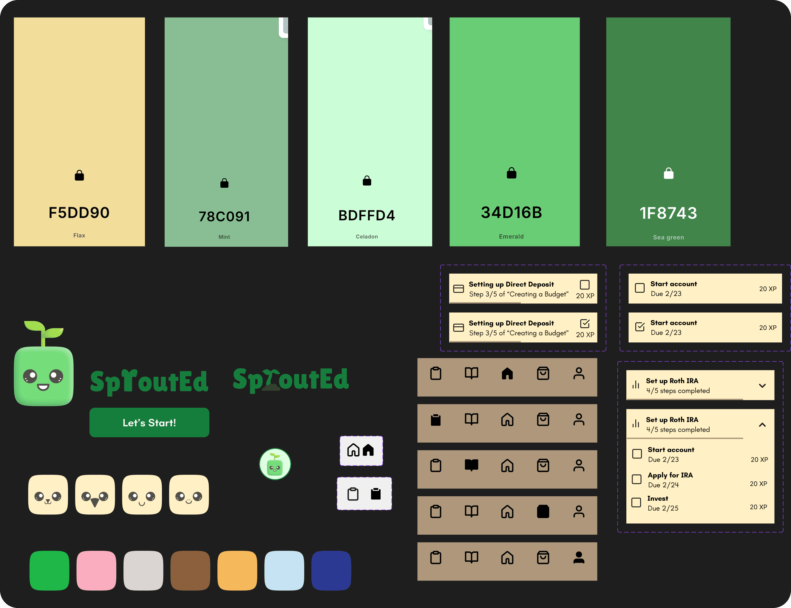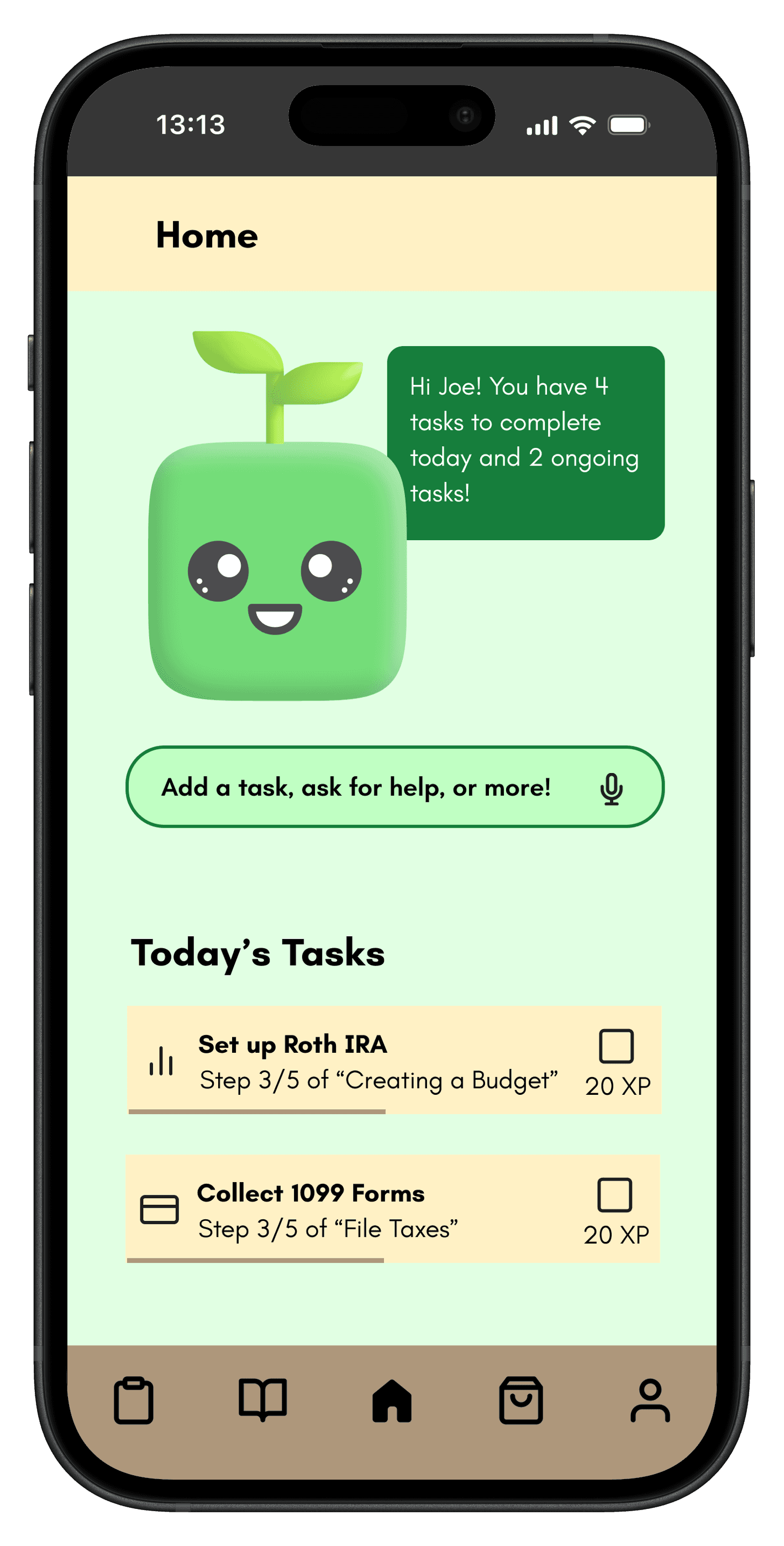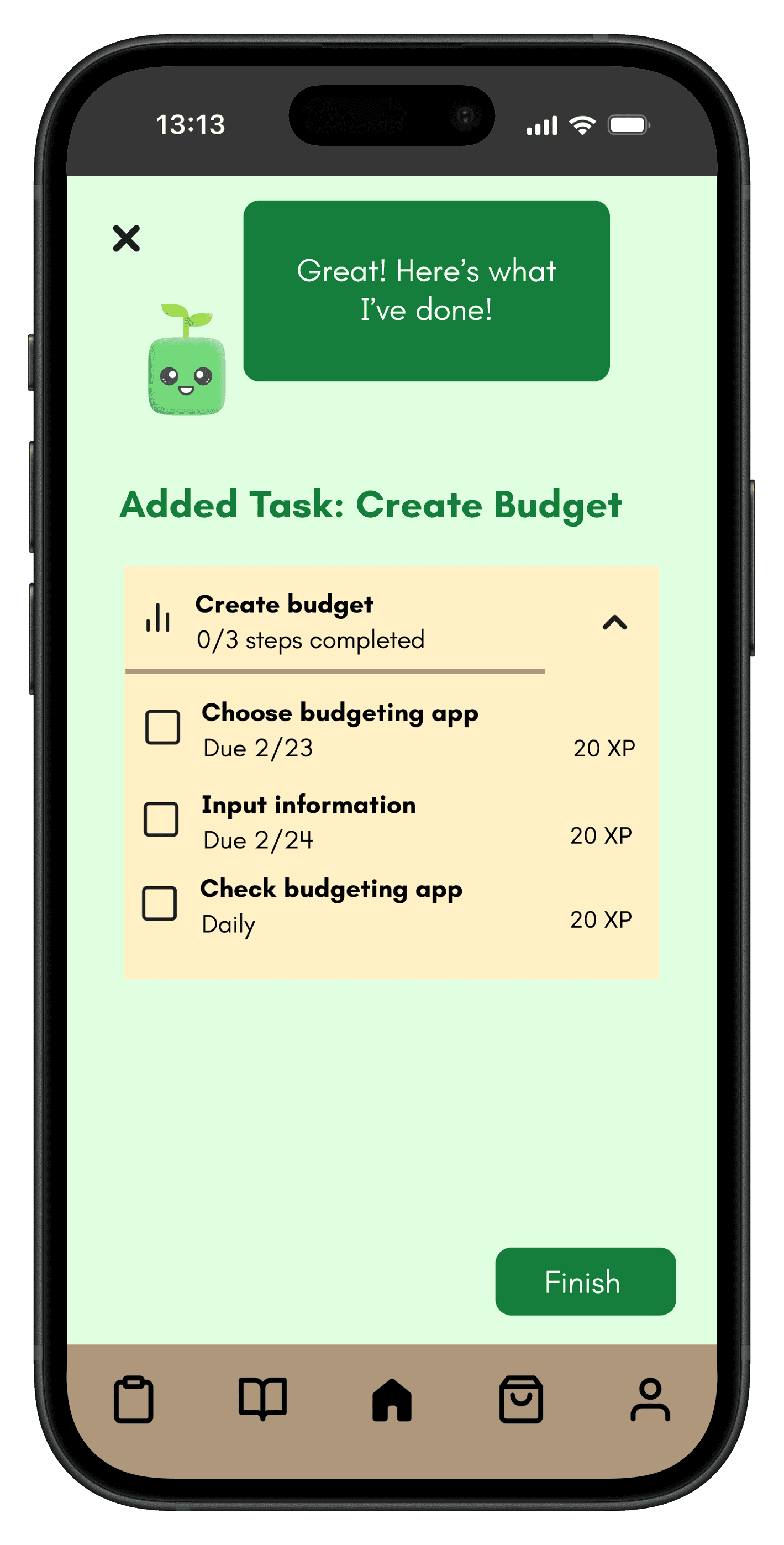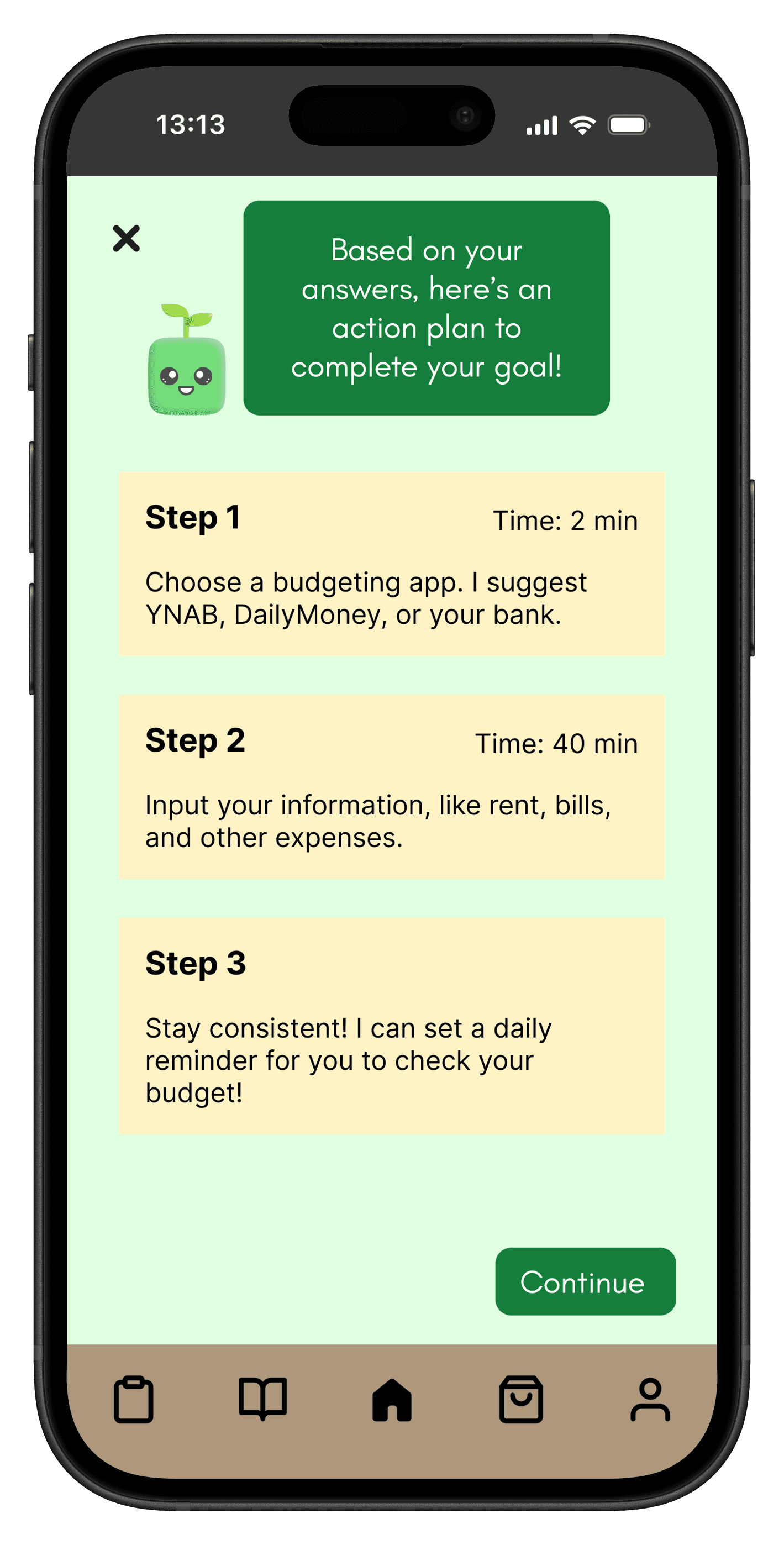 The design was heavily influenced by our research, as we wanted the visuals to feel like a helping hand, not another source of stress. We designed the "Sprout" mascot and brand identity around a sprouting plant, symbolizing the growth and confidence young adults would gain from using the app.